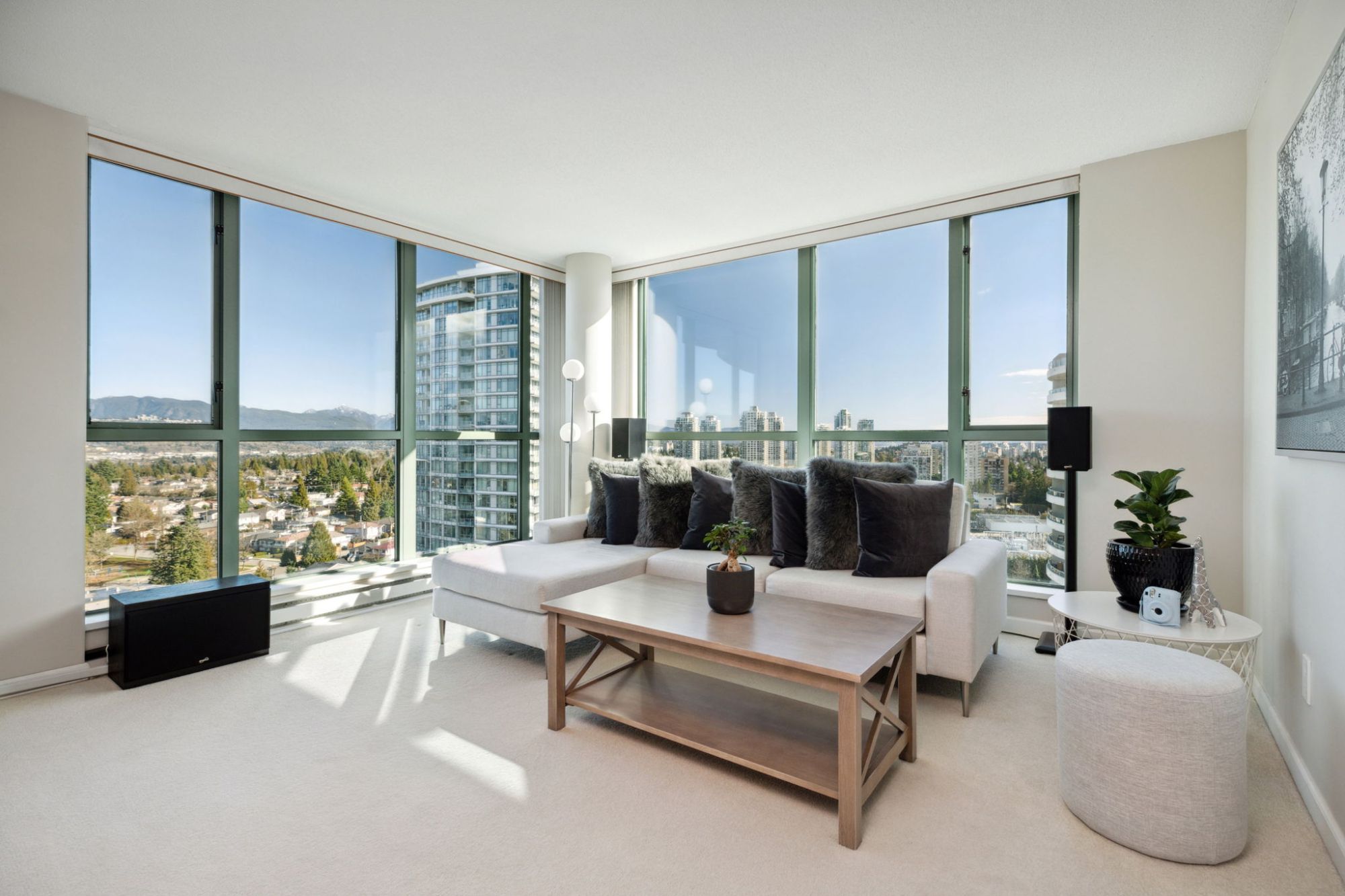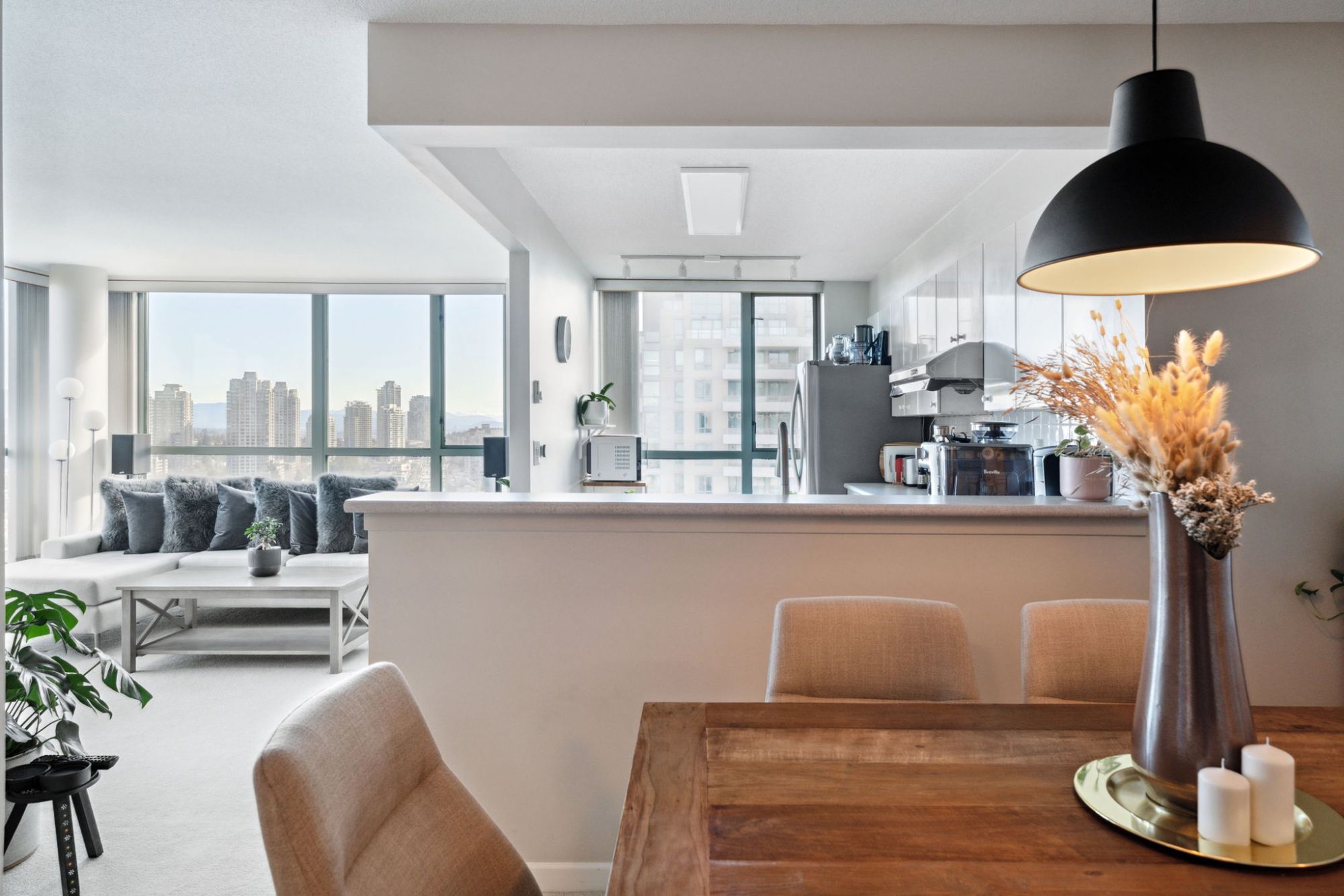 Perched on the 19th floor, this condo offers unparalleled views that sweep from the bustling heart of downtown Vancouver across to the sprawling urban expanse of Metrotown, before stretching north to the majestic North Shore Mountains and reaching as far as Tsawwassen's serene landscapes. Each window frames a living portrait, capturing a diverse tapestry of British Columbia's most stunning vistas, ensuring there's always a captivating scene to behold.